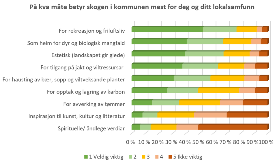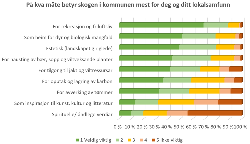 For å forstå meir om kva verdiar som vinn fram i skogforvaltinga, og kvifor, spurte vi innbyggjarane i 10 distriktskommunar om deira forhold til skog. Heile 72 prosent svara at skog er viktig for dei. På spørsmål om på kva måte skog er viktigast for dei og deira lokalsamfunn, legg folk særleg vekt på rekreasjon og friluftsliv, og skogen som heim for dyr og biologisk mangfald.